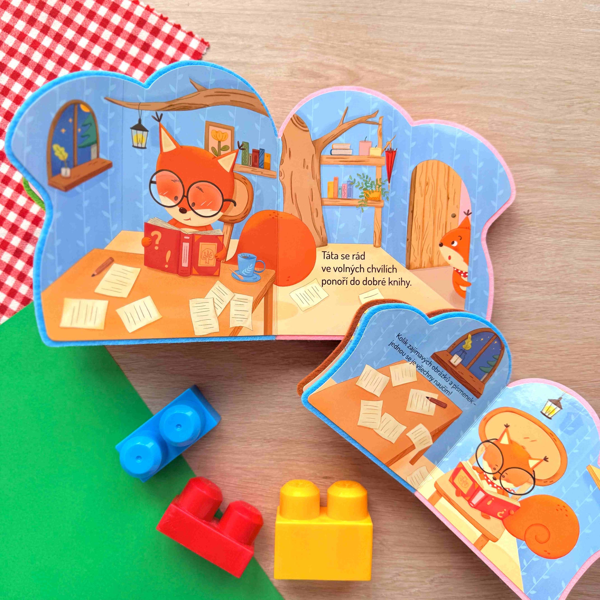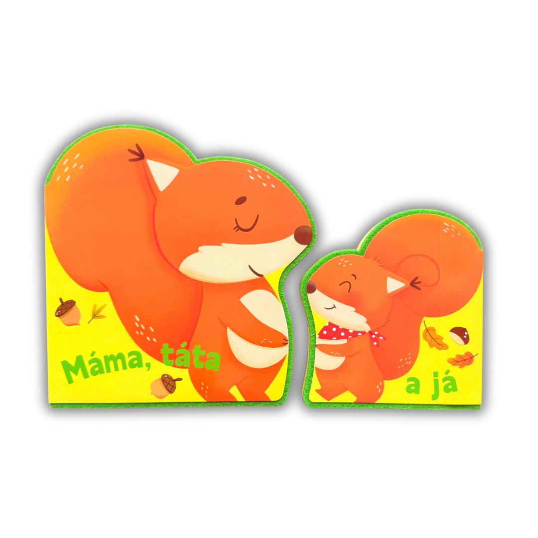 Sada Máma, táta a já se skládá ze dvou roztomilých knížek ve tvaru veverek – větší představuje svět rodičů a menší svět dětí.
