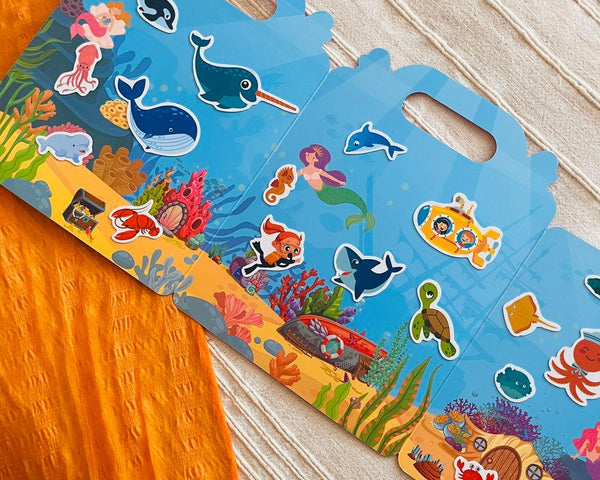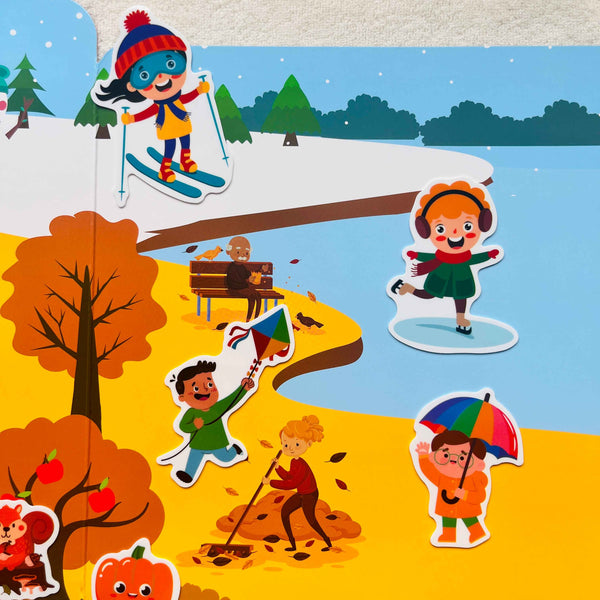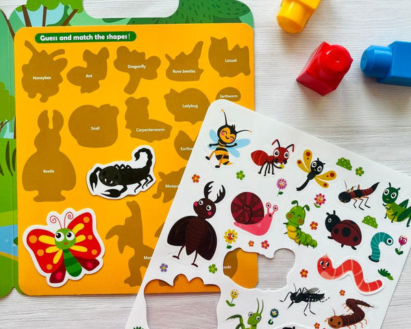 - Každá příběhová sada obsahuje arch s gumovými nálepkami a rozevíratelné pozadí s přírodním zátiším i se stranou, na které se nacházejí stíny zvířátek.