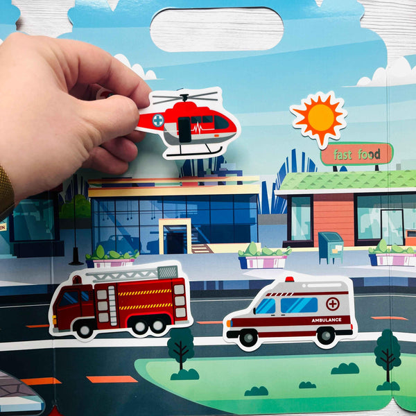 - 24 gumolepek a rozkládací pozadí se scénami městské ulice, stejně jako strana se stíny různých dopravních prostředků.