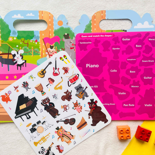 - 28 gumolepek a rozkládací pozadí s vyobrazením koncertní scény a stranou, na které se nacházejí stíny. Úkolem dítěte je nalepit samolepku na správný stín.