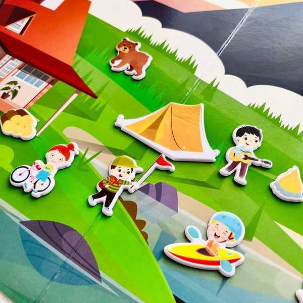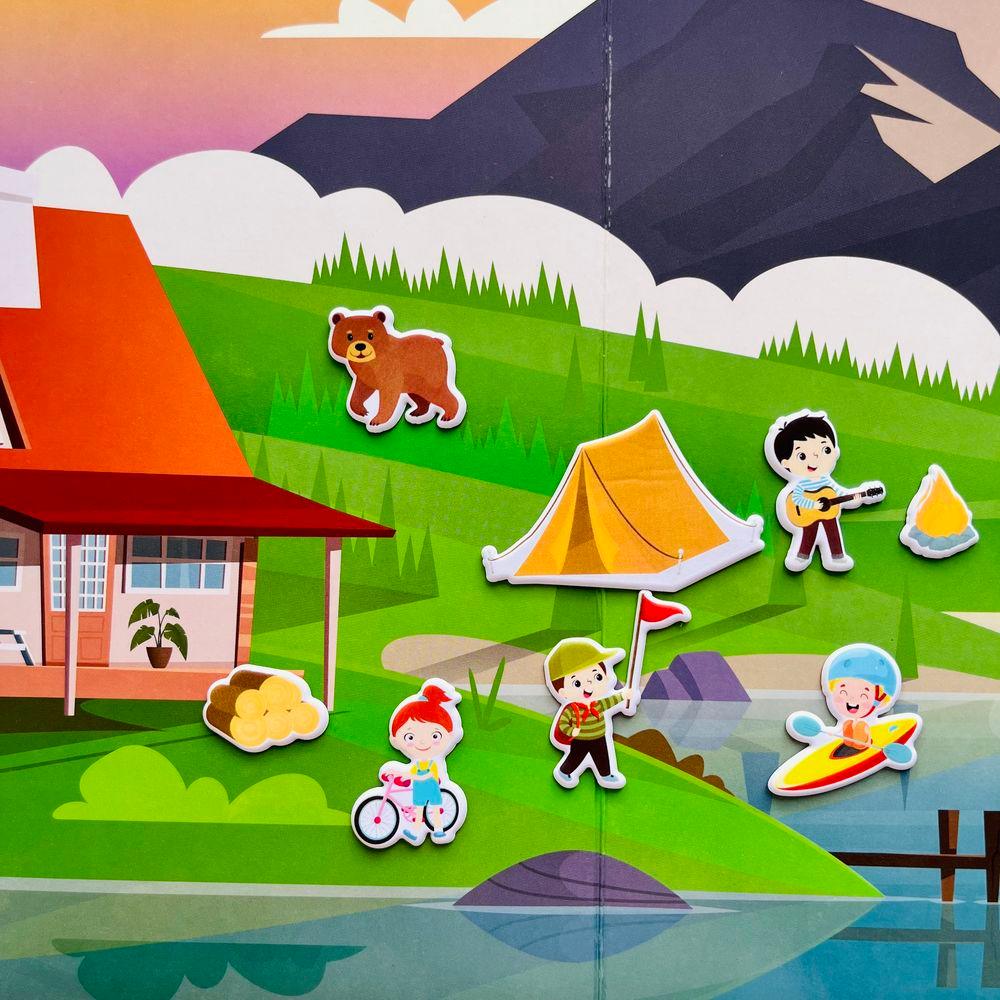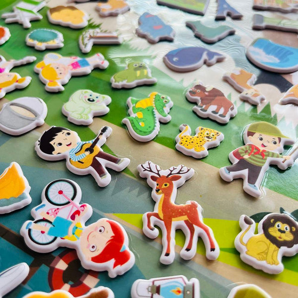 - Každé balení obsahuje oboustranné pozadí s dvěma barevnými scenériemi a desítkami nálepek, které se postarají o magické tvořivé a hravé chvilky.