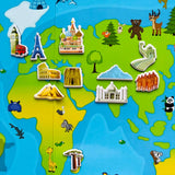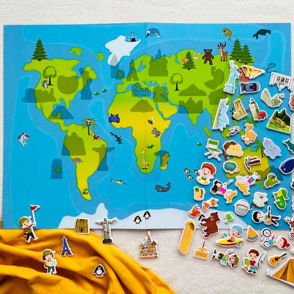 Roztomilá příběhová sada se scenériemi pokojů mapy světa a chaty u jezera.