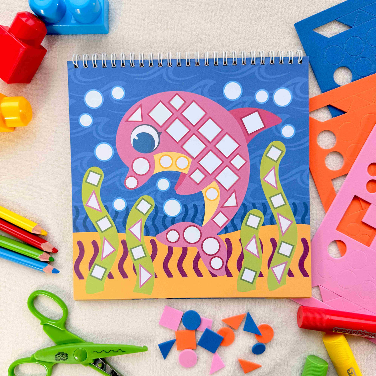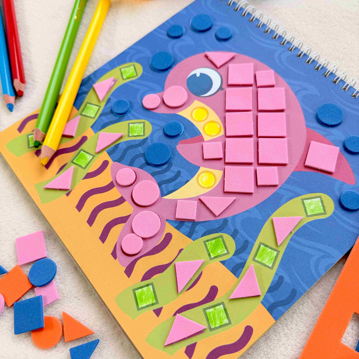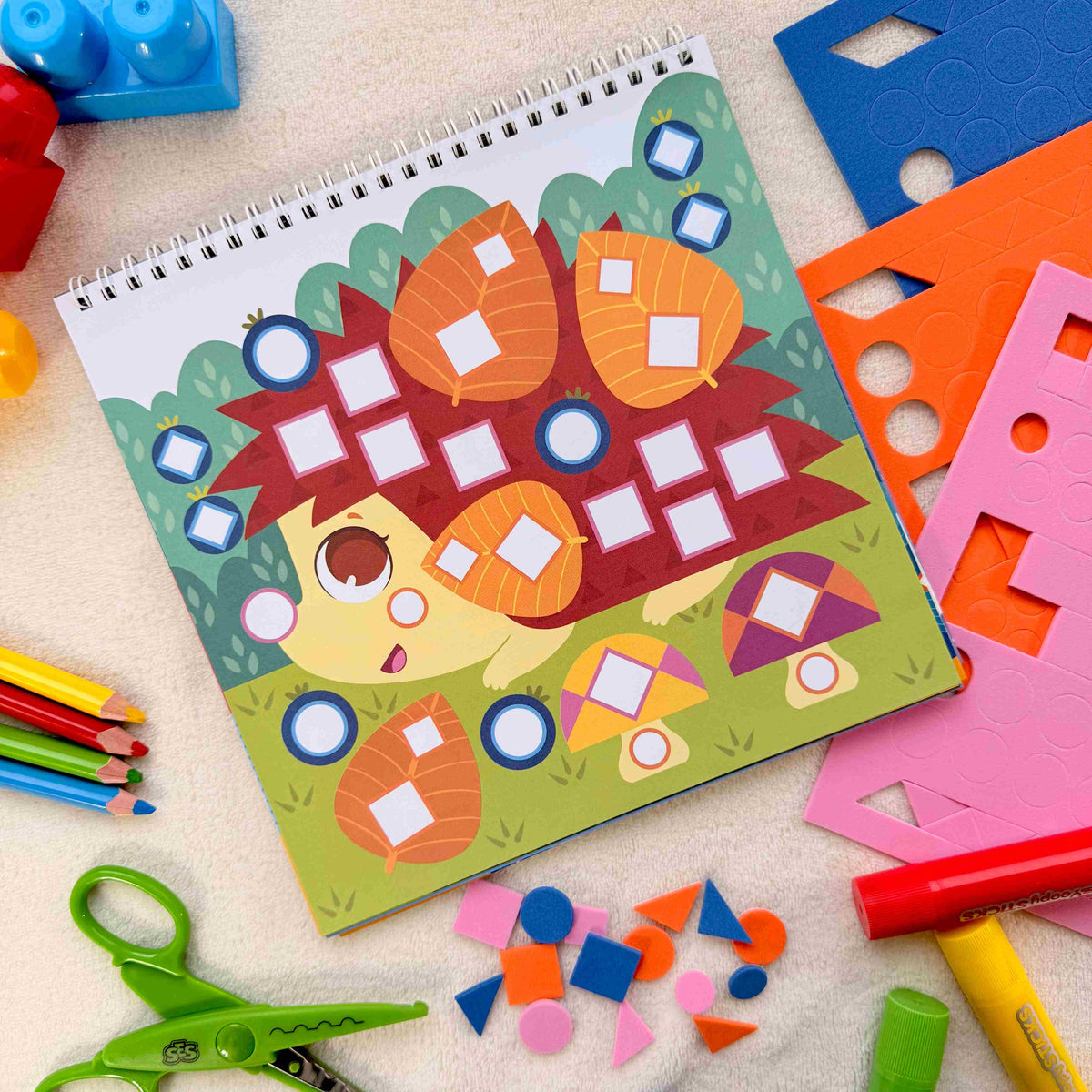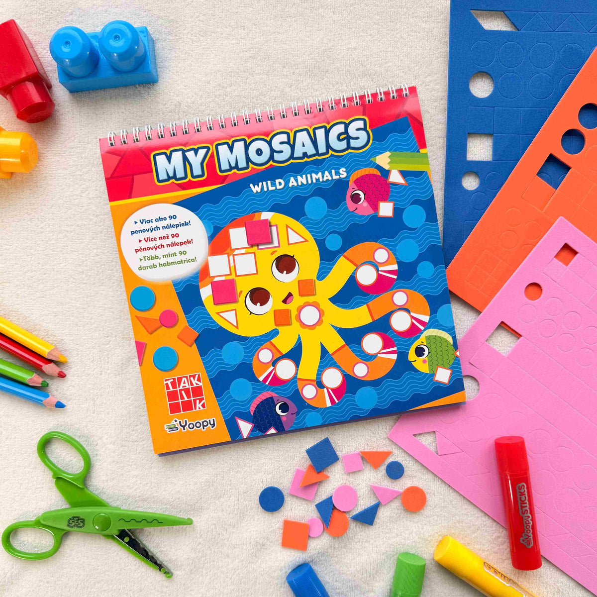 - sada obsahuje 3 archy s více než 90 pěnovými samolepkami a sešit s 18 pestrými obrázky